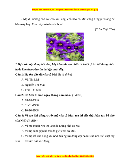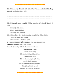 Câu 1: Họ tên đầy đủ của cô Mai là: (1 điểm) A. Vũ Thị Mai B. Nguyễn Thị Mai C. Trần Thị Mai