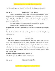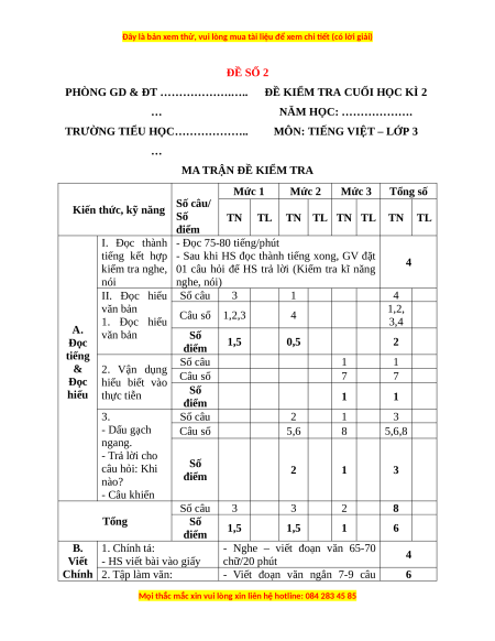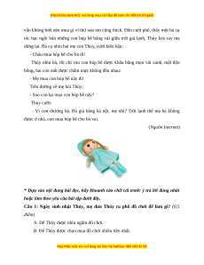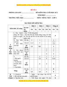 kiểm tra nghe, 01 câu hỏi để HS trả lời (Kiểm tra kĩ năng nói nghe, nói) II. Đọc hiểu Số câu 3 1 4 văn bản 1,2, Câu số 1,2,3 4 1. Đọc hiểu 3,4 A. văn bản Số Đọc 1,5 0,5 2 điểm tiếng Số câu 1 1 & 2. Vận dụng Đọc Câu số 7 7 hiểu biết vào hiểu thực tiễn Số 1 1 điểm 3. Số câu 2 1 3 - Dấu gạch Câu số 5,6 8 5,6,8 ngang. - Trả lời cho câu hỏi: Khi Số 2 1 3 nào? điểm - Câu khiến Số câu 3 3 2 8 Tổng Số 1,5 1,5 1 6 điểm B. 1. Chính tả: