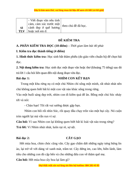 A. PHẦN KIỂM TRA ĐỌC (10 điểm) – Thời gian làm bài 40 phút