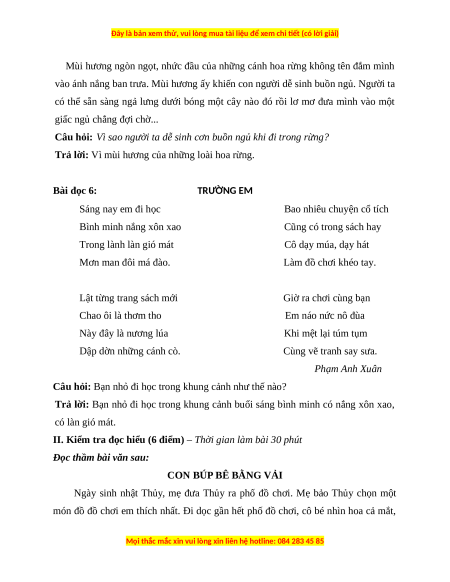 II. Kiểm tra đọc hiểu (6 điểm) – Thời gian làm bài 30 phút