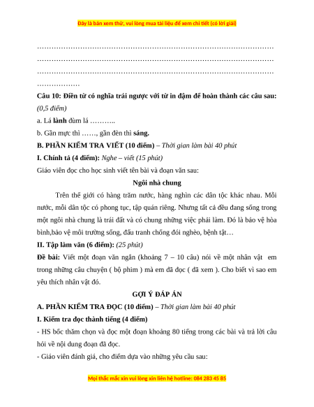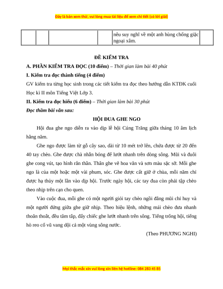 A. PHẦN KIỂM TRA ĐỌC (10 điểm) – Thời gian làm bài 40 phút