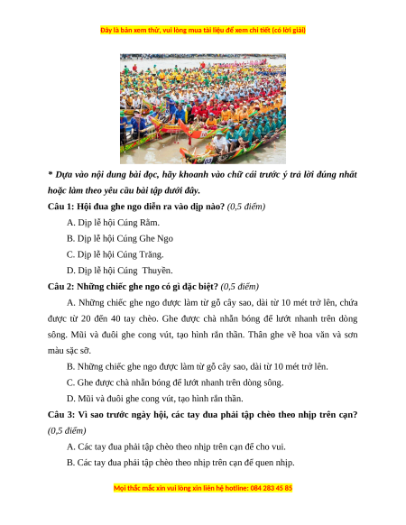 Câu 1: Hội đua ghe ngo diễn ra vào dịp nào? (0,5 điểm)