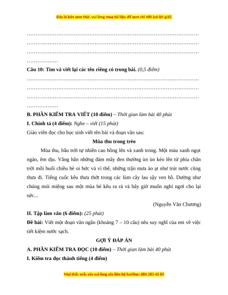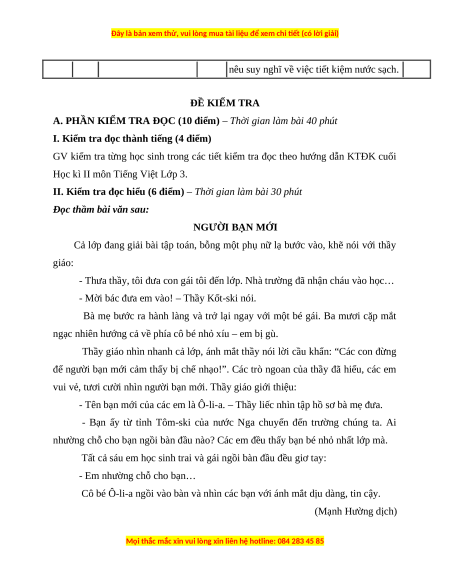 A. PHẦN KIỂM TRA ĐỌC (10 điểm) – Thời gian làm bài 40 phút