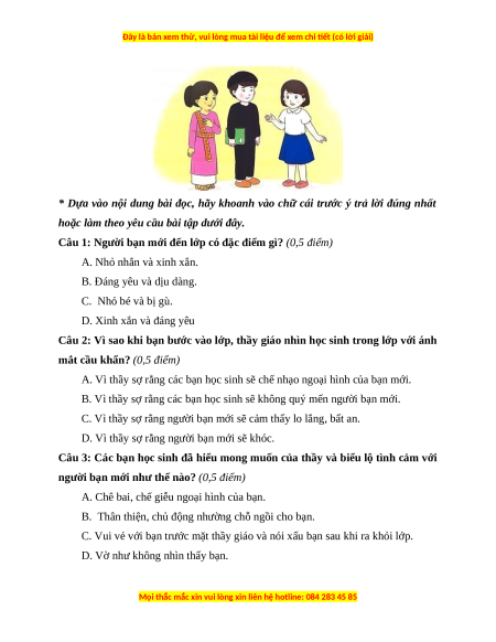 Câu 1: Người bạn mới đến lớp có đặc điểm gì? (0,5 điểm)