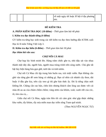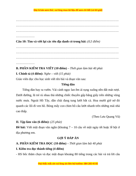 A. PHẦN KIỂM TRA ĐỌC (10 điểm) – Thời gian làm bài 40 phút