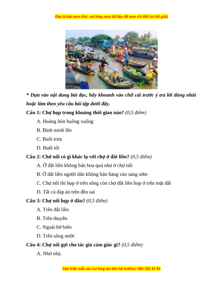 Câu 3: Chợ nổi họp ở đâu? (0,5 điểm) A. Trên đất liền B. Trên thuyền C. Ngoài bờ biển D. Trên sông nước