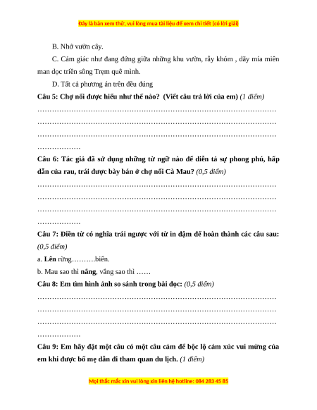 Câu 1: Chợ họp trong khoảng thời gian nào? (0,5 điểm) A. Hoàng hôn buông xuống B. Bình minh lên C. Buổi trưa D. Buổi tối
