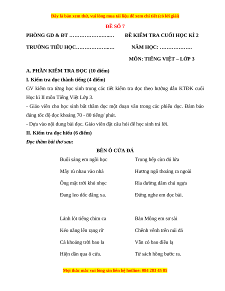 A. PHẦN KIỂM TRA ĐỌC (10 điểm)