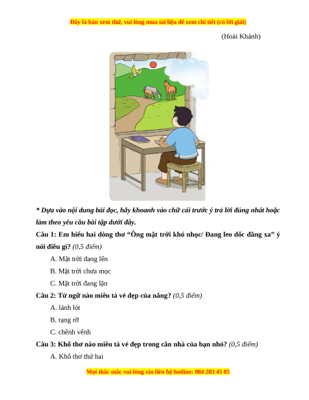 nói điều gì? (0,5 điểm) A. Mặt trời đang lên B. Mặt trời chưa mọc C. Mặt trời đang lặn