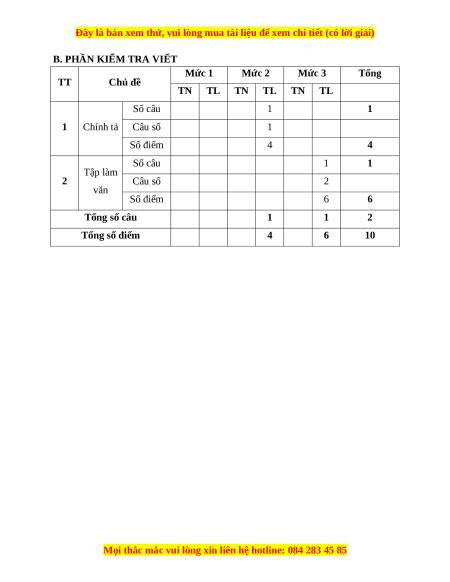 B. PHẦN KIỂM TRA VIẾT Mức 1 Mức 2 Mức 3 Tổng TT Chủ đề TN TL TN TL TN TL Số câu 1 1 1 Chính tả Câu số 1 Số điểm 4 4 Số câu 1 1 Tập làm 2 Câu số 2 văn Số điểm 6 6 Tổng số câu 1 1 2 Tổng số điểm 4 6 10