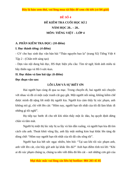 Đề thi cuối kì 2 Tiếng Việt lớp 4 Chân trời sáng tạo (Đề 4)