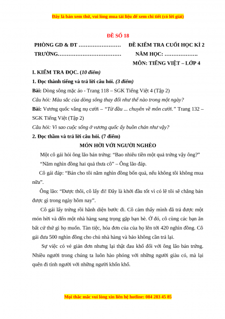 Đề thi cuối kì 2 Tiếng Việt lớp 4 (Đề 18)