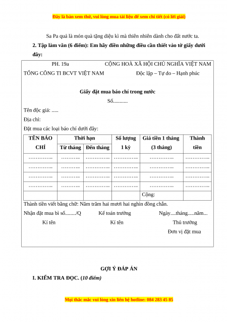 I. KIỂM TRA ĐỌC. (10 điểm)