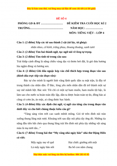 Đề thi cuối kì 2 Tiếng Việt lớp 4 (Đề 4)