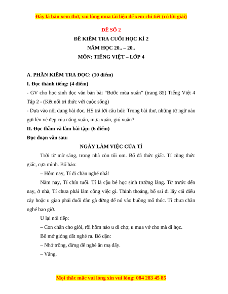 - Tailieugiaovien.com.vn giới thiệu bộ 10 đề cuối kì 2 gồm đầy đủ ma trận và lời giải chi tiết môn Tiếng việt lớp 4 Kết nối tri thức mới nhất nhằm giúp Giáo viên có thêm tài liệu tham khảo ra đề thi Tiếng việt lớp 4.