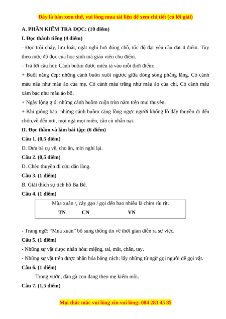 A. PHẦN KIỂM TRA ĐỌC: (10 điểm)