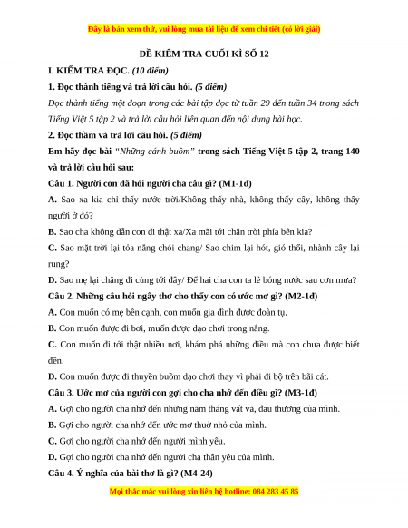 Đề thi cuối kì 2 Tiếng Việt lớp 5 năm 2023 (Đề 12)