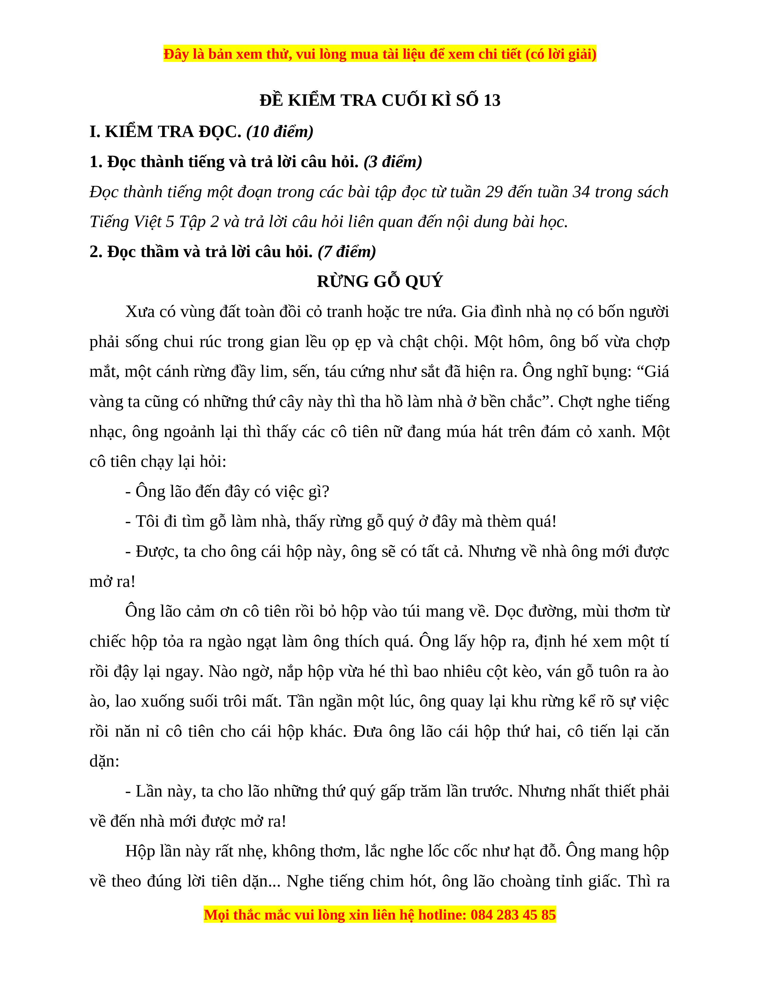 2. Đọc thầm và trả lời câu hỏi. (7 điểm) RỪNG GỖ QUÝ