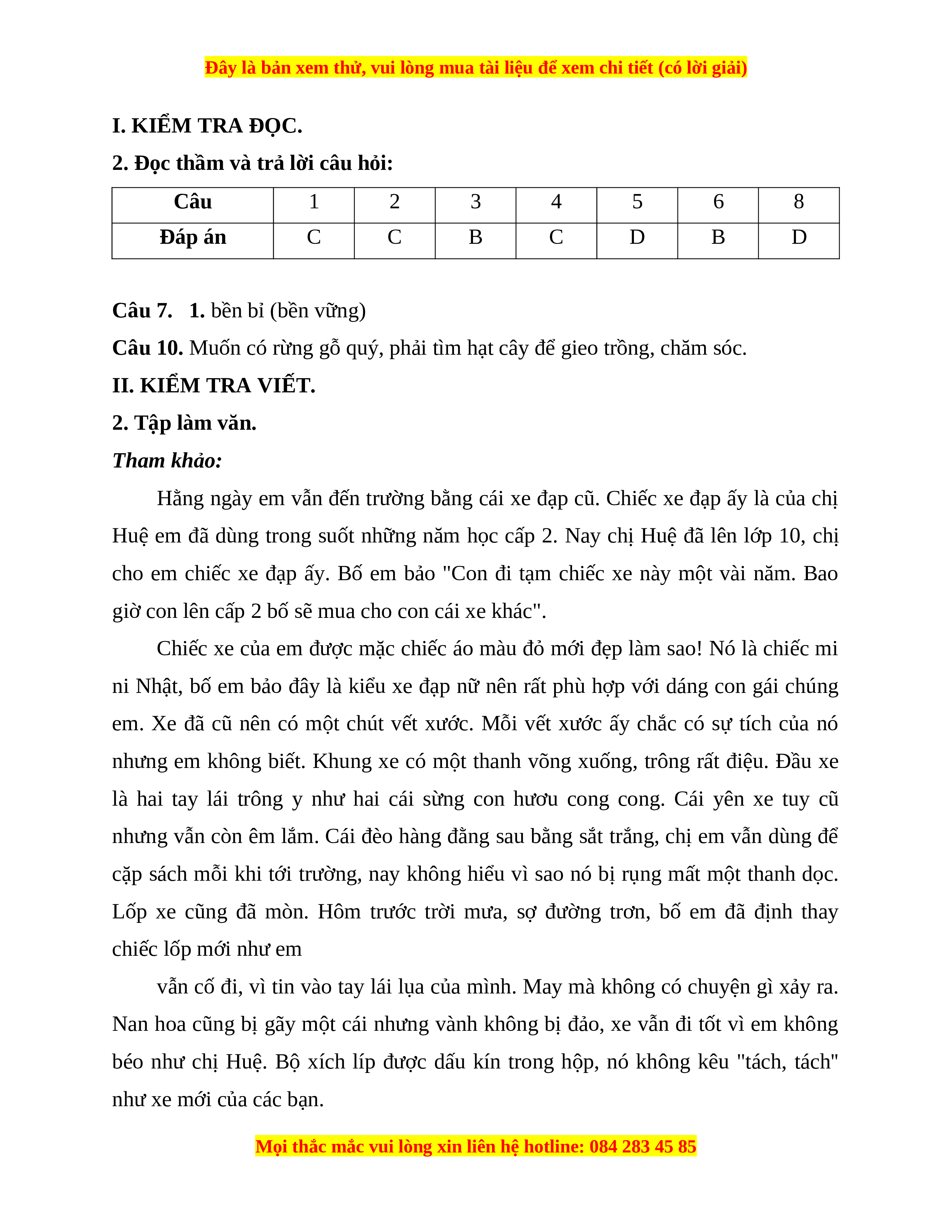 I. KIỂM TRA ĐỌC. (10 điểm)
