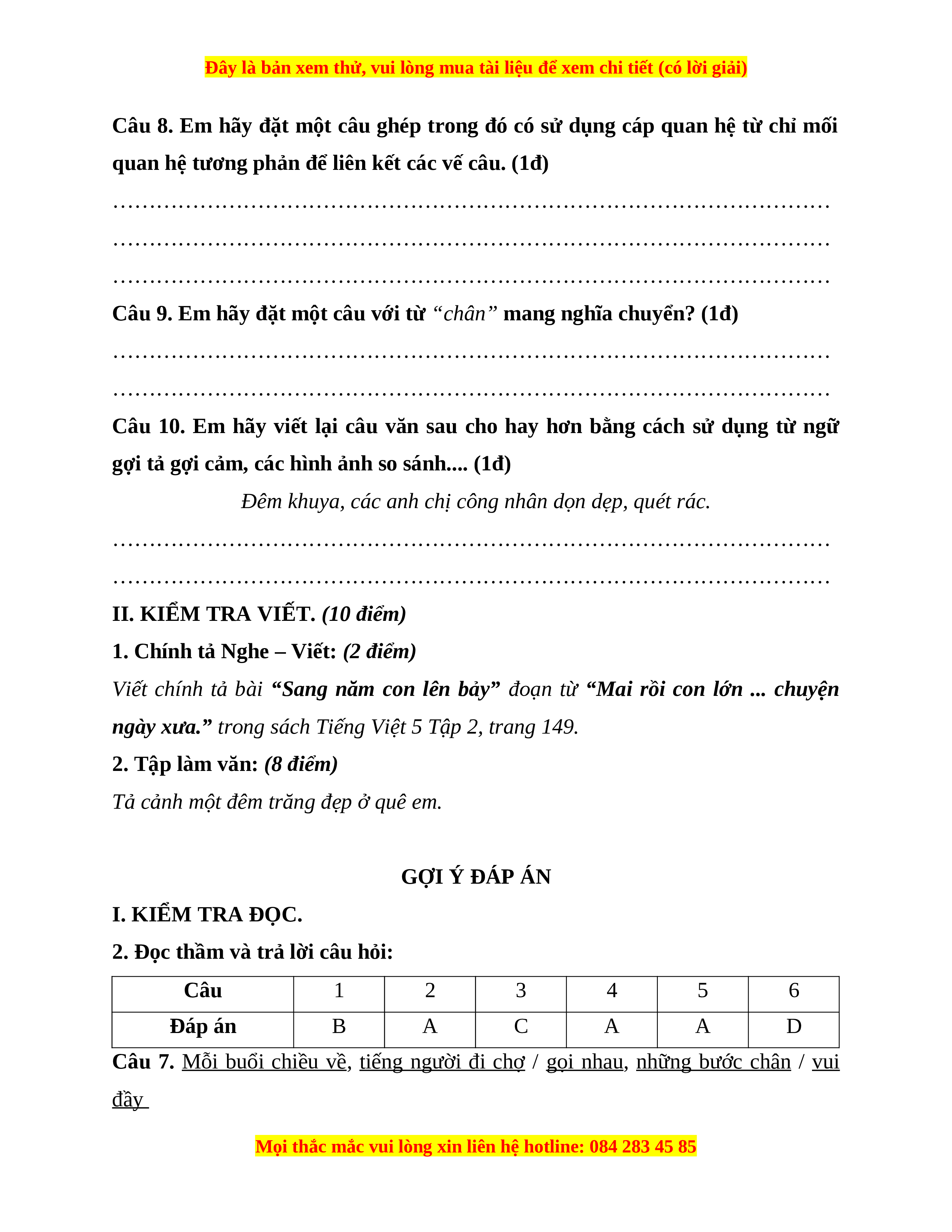 I. KIỂM TRA ĐỌC. (10 điểm)