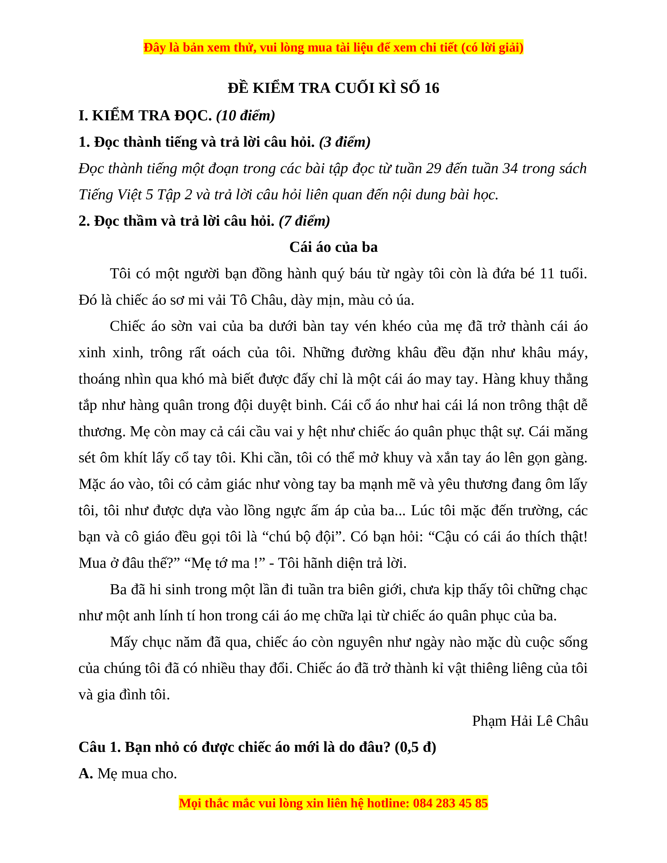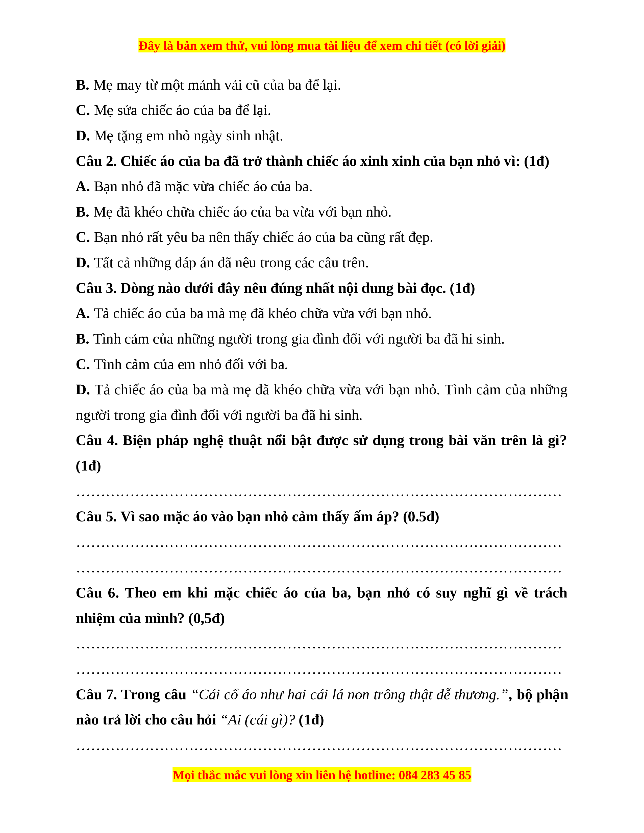 2. Đọc thầm và trả lời câu hỏi. (7 điểm) Cái áo của ba