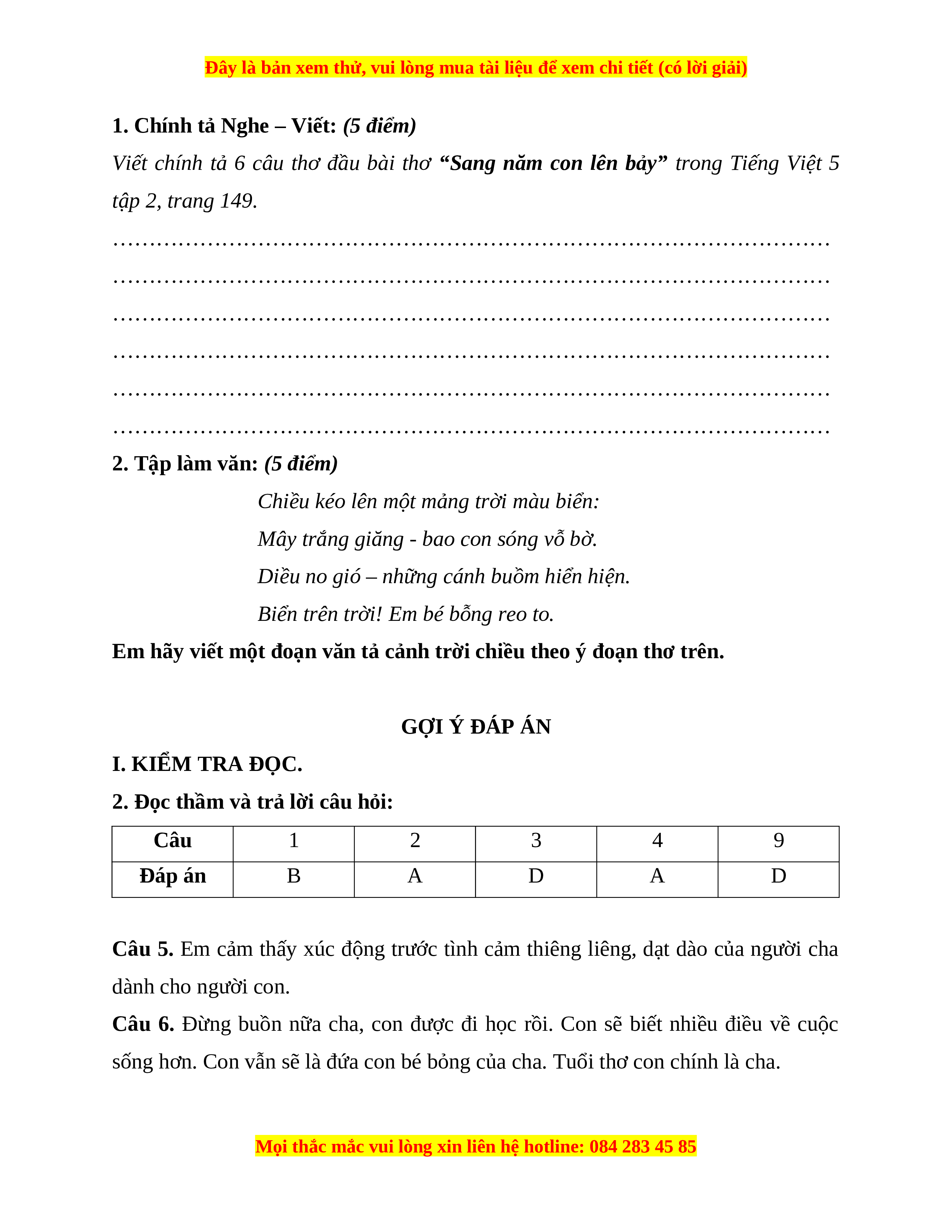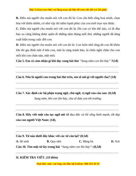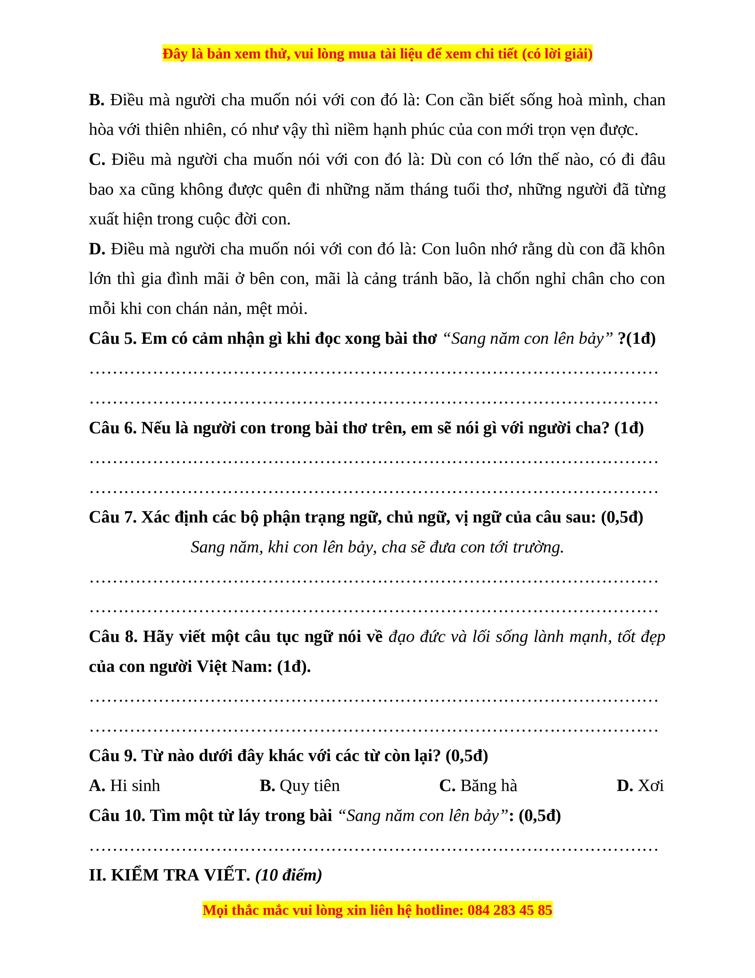 Câu 5. Em có cảm nhận gì khi đọc xong bài thơ “Sang năm con lên bảy” ?(1đ)