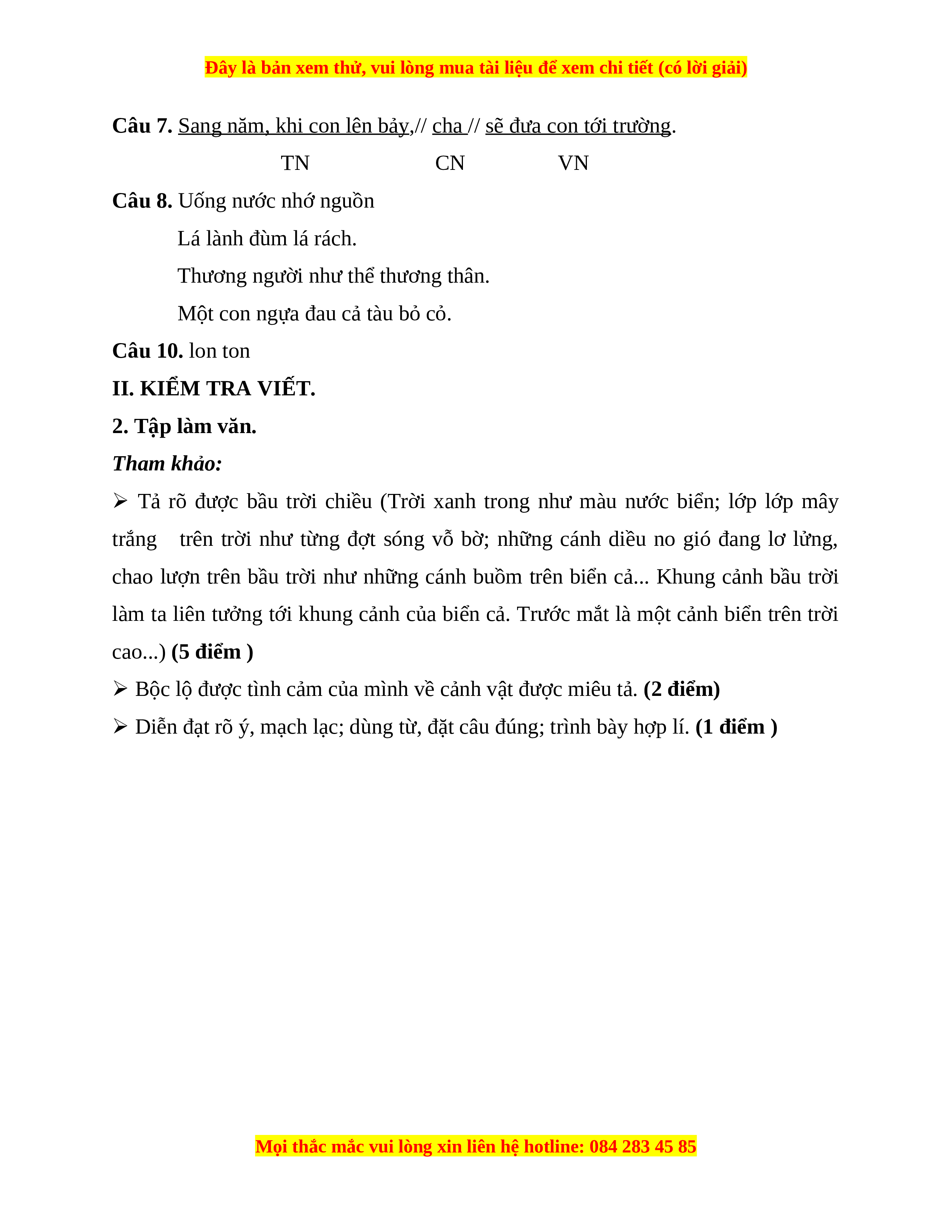Câu 7. Sang năm, khi con lên bảy,// cha // sẽ đưa con tới trường. TN CN VN