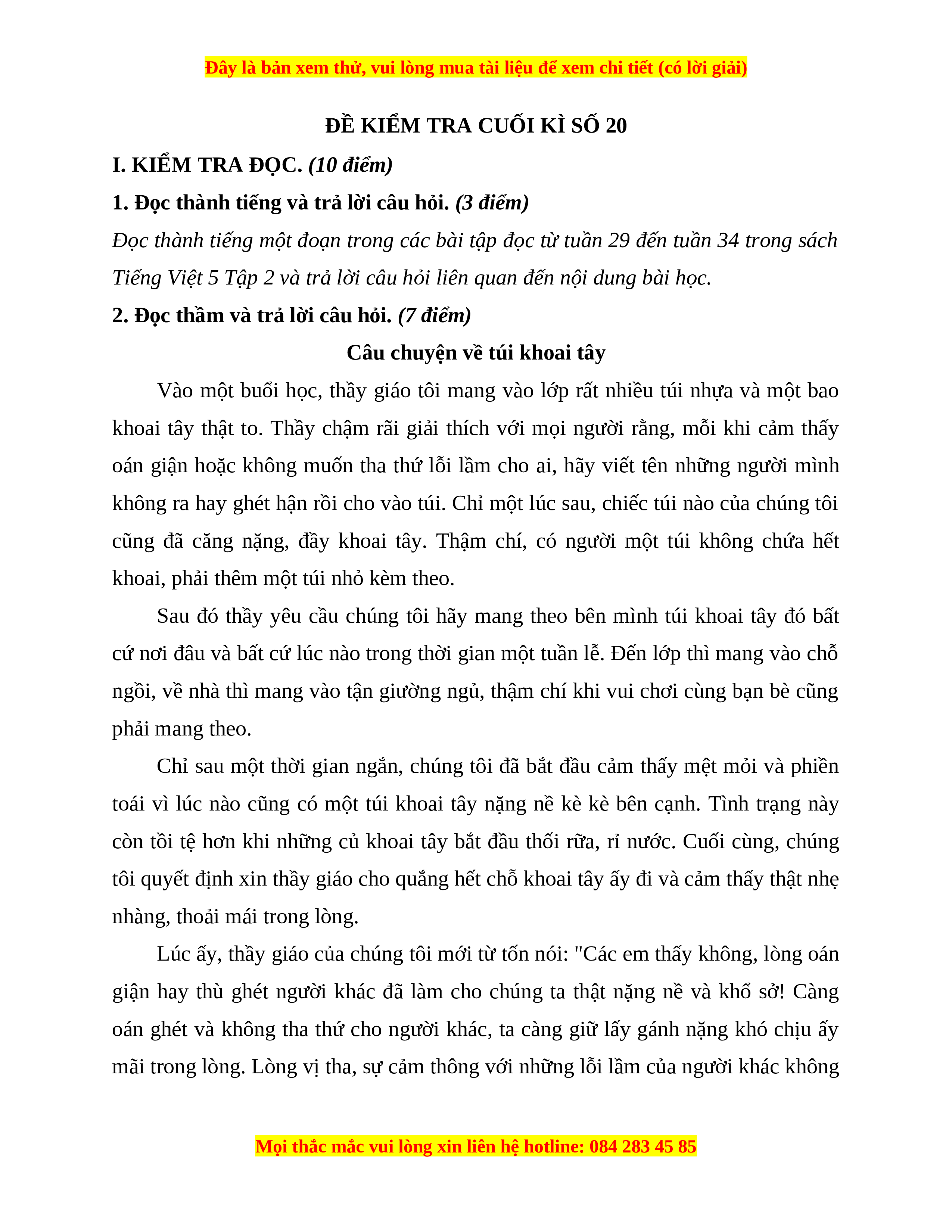I. KIỂM TRA ĐỌC. (10 điểm)
