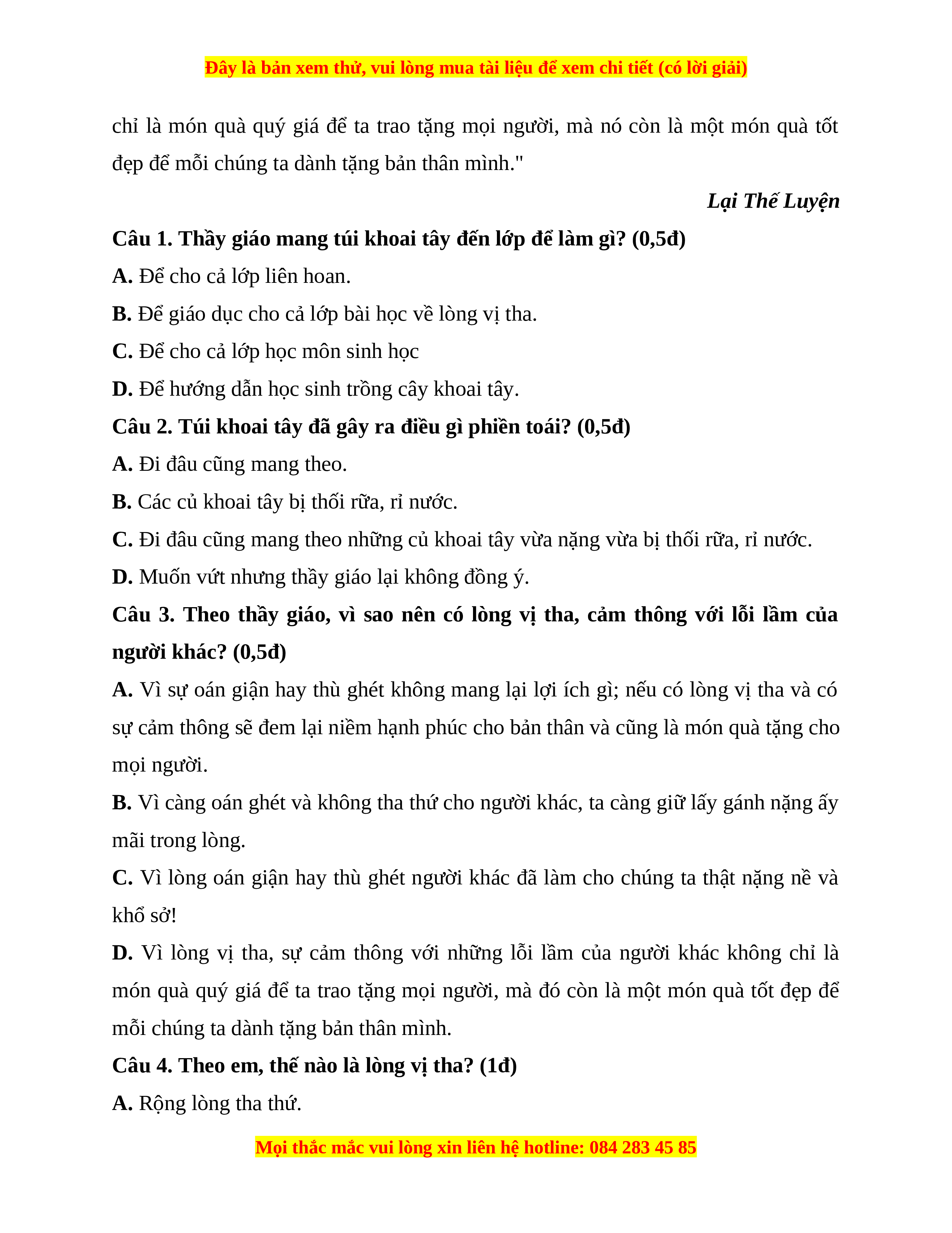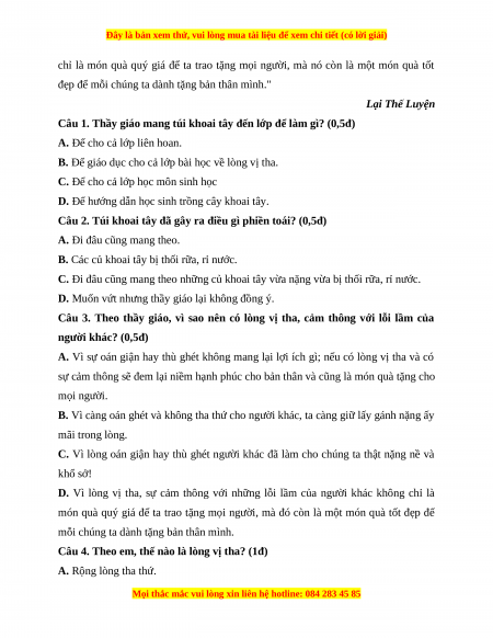 Câu 3. Theo thầy giáo, vì sao nên có lòng vị tha, cảm thông với lỗi lầm của