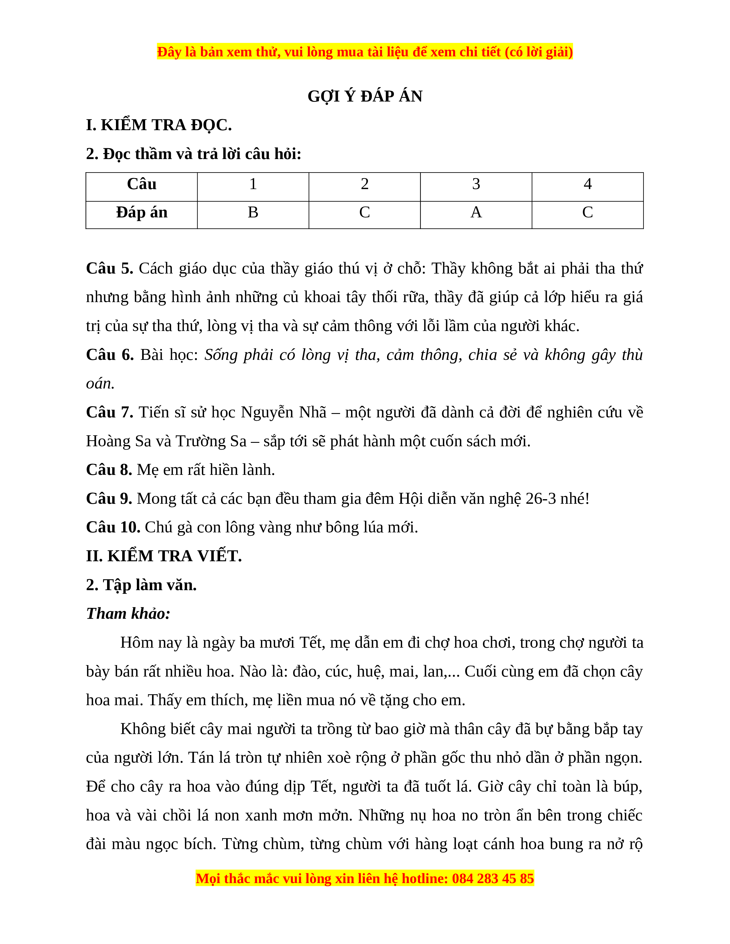 GỢI Ý ĐÁP ÁN I. KIỂM TRA ĐỌC.