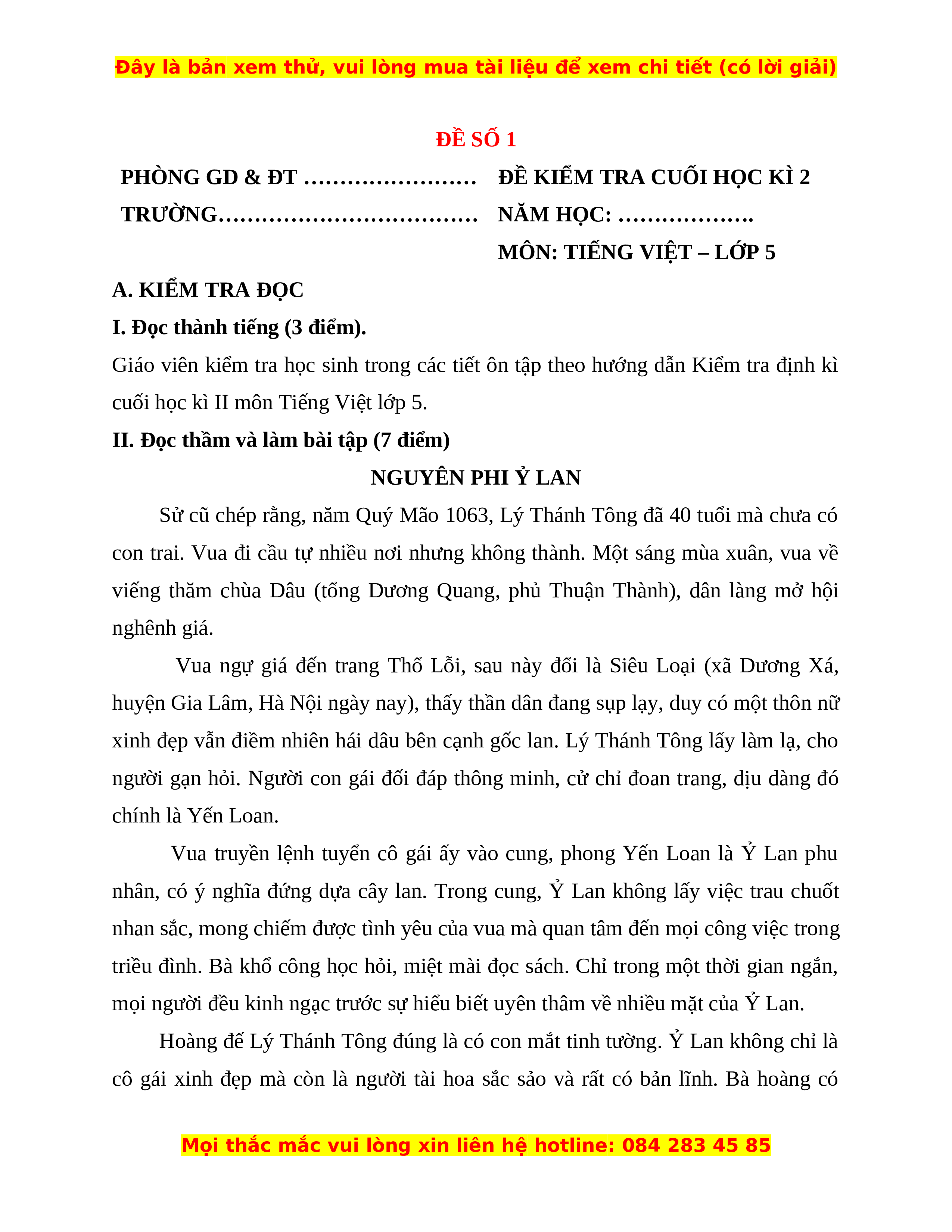 II. Đọc thầm và làm bài tập (7 điểm) NGUYÊN PHI Ỷ LAN