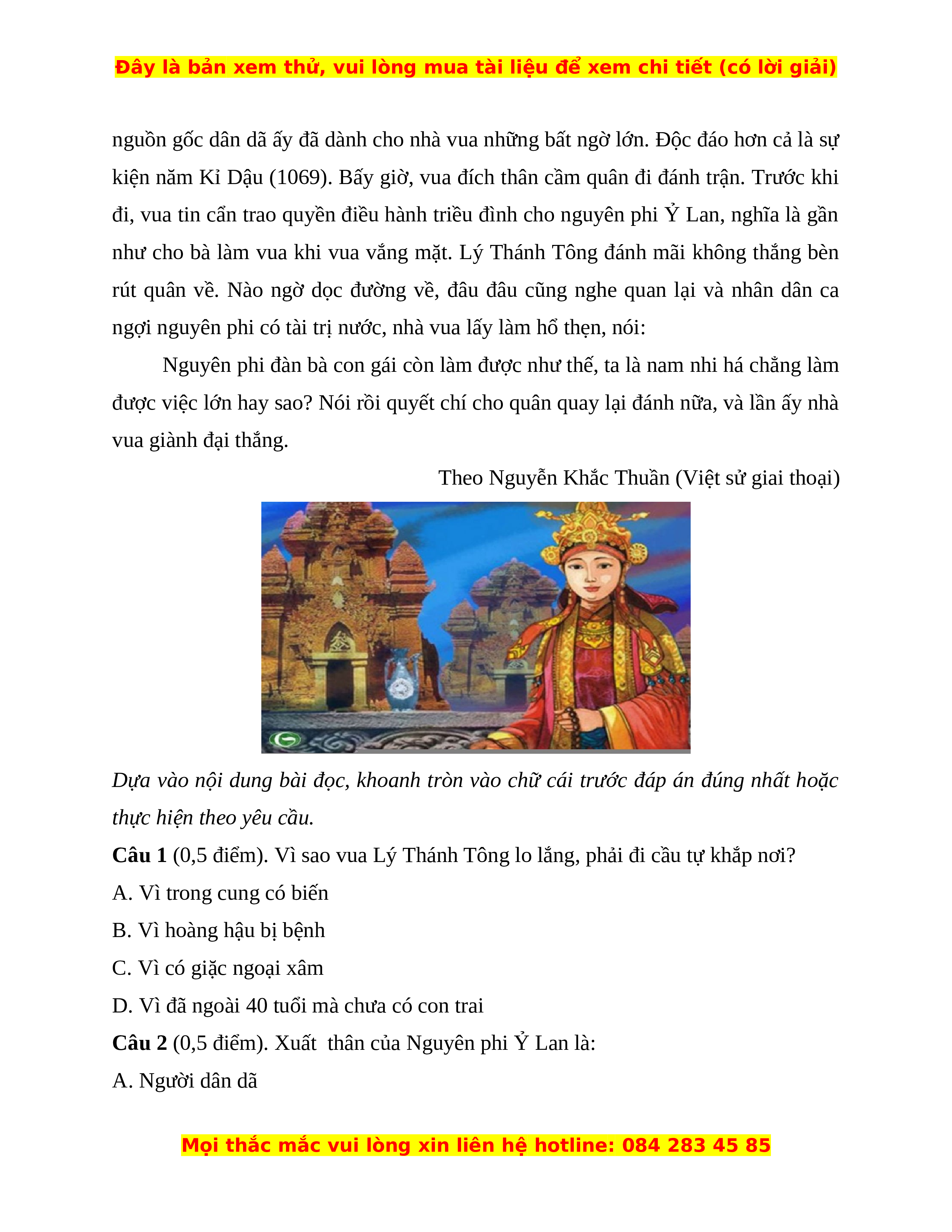 Câu 2 (0,5 điểm). Xuất thân của Nguyên phi Ỷ Lan là: A. Người dân dã