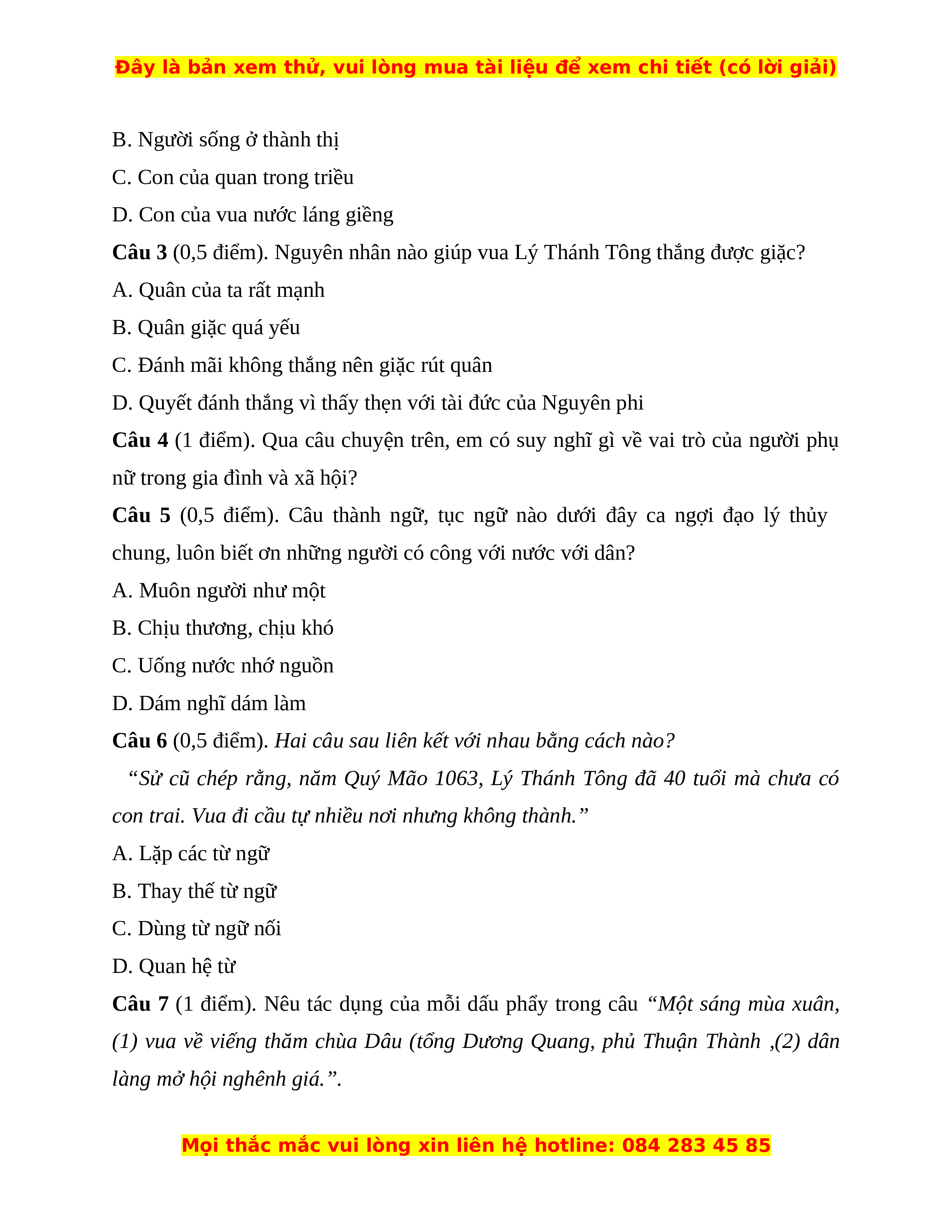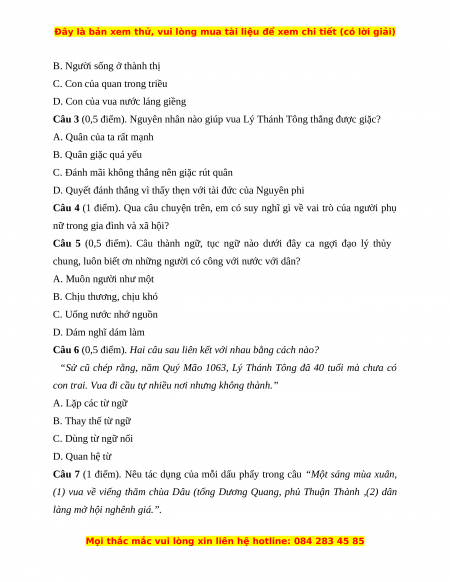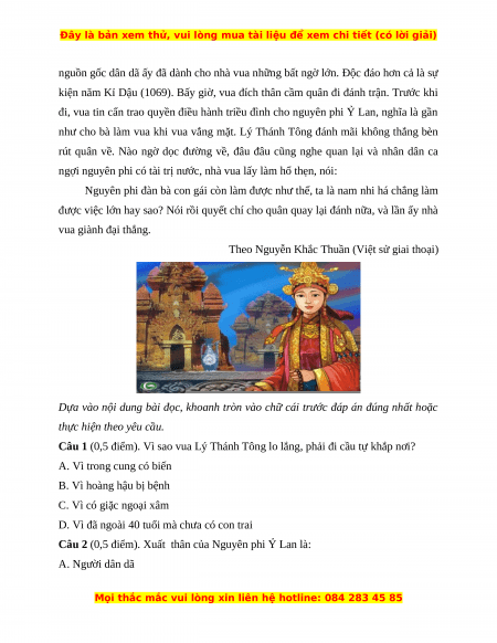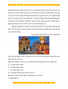 Câu 3 (0,5 điểm). Nguyên nhân nào giúp vua Lý Thánh Tông thắng được giặc? A. Quân của ta rất mạnh B. Quân giặc quá yếu