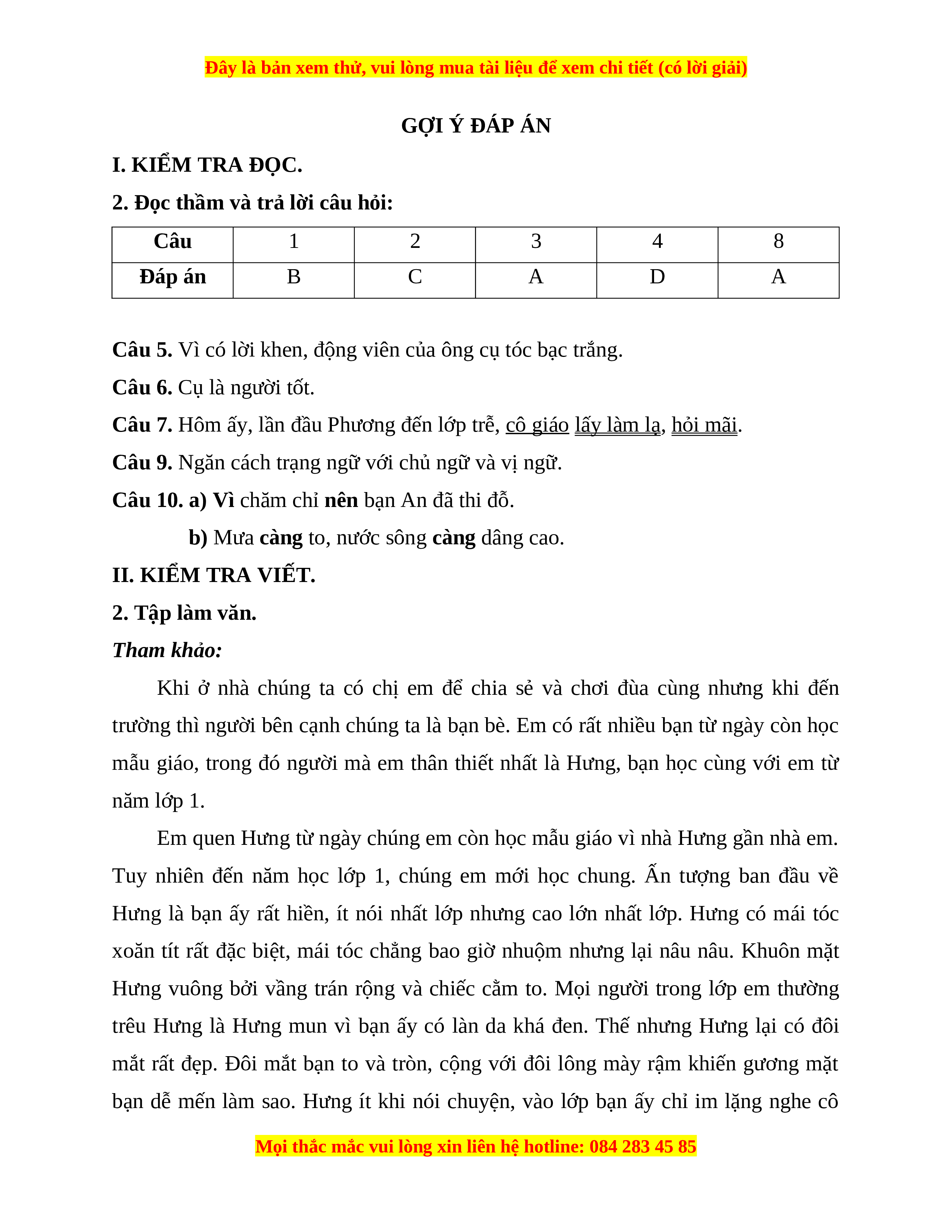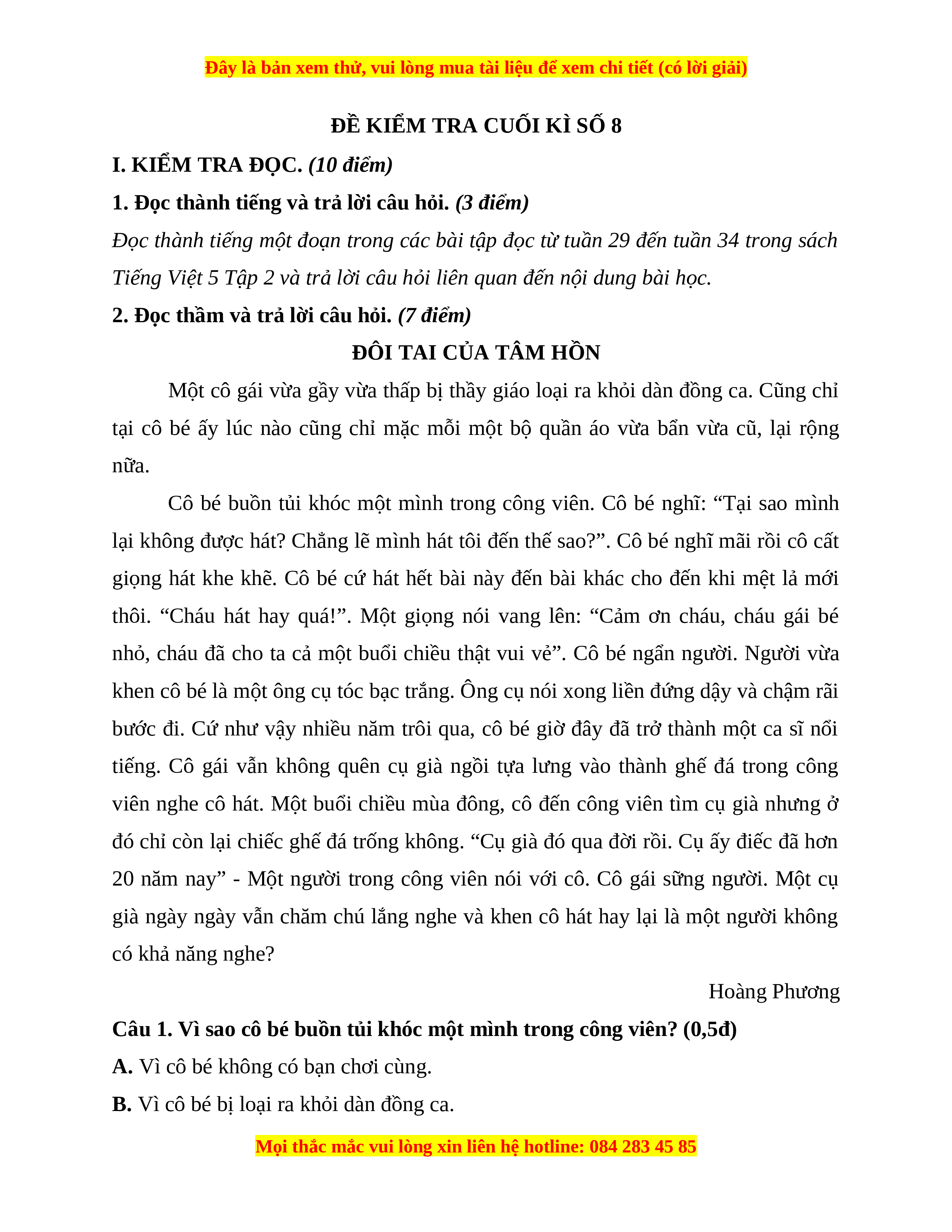 I. KIỂM TRA ĐỌC. (10 điểm)