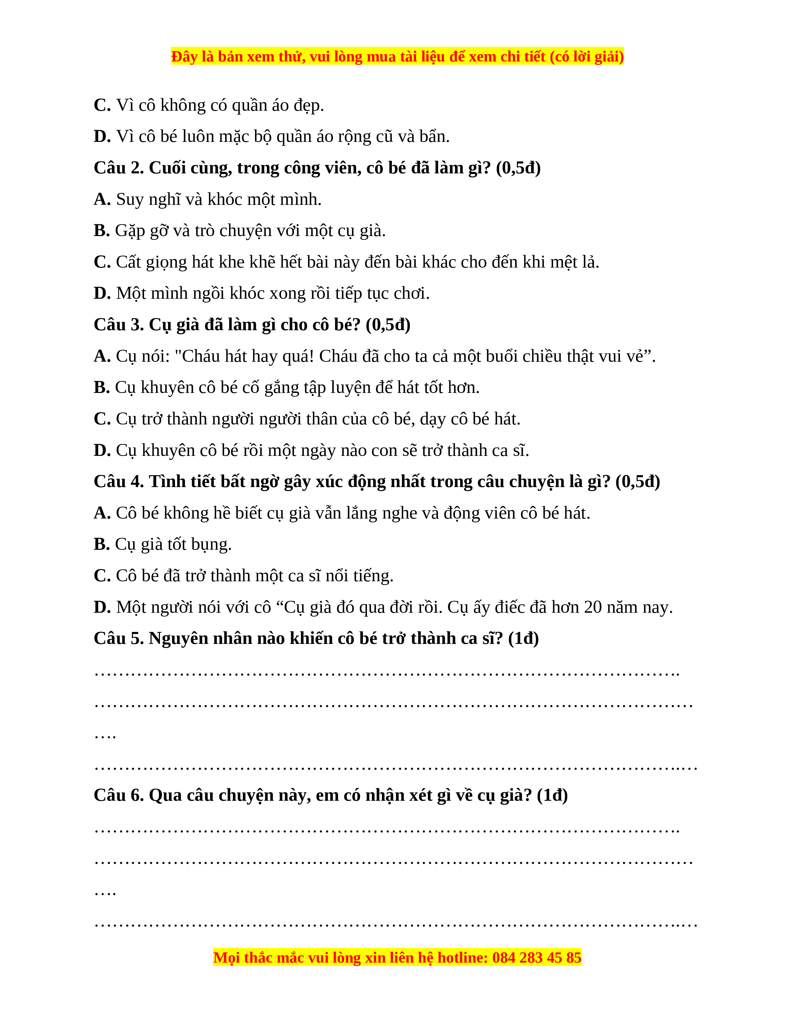 Câu 3. Cụ già đã làm gì cho cô bé? (0,5đ)