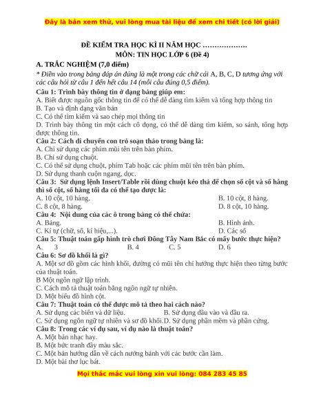 MÔN: TIN HỌC LỚP 6 (Đề 4)