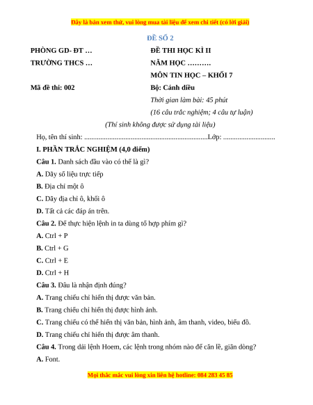 MÔN TIN HỌC – KHỐI 7 Mã đề thi: 002 Bộ: Cánh diều
