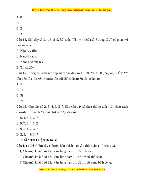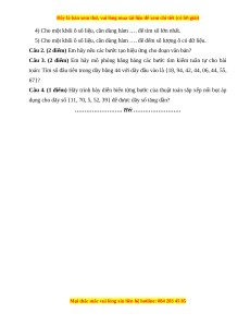 Câu 14. Cho dãy số 2, 4, 6, 8, 9. Bài toán “Tìm vị trí của số 8 trong dãy”, có phạm vi tìm kiếm là: A. Nửa dãy đầu. B. Nửa dãy sau.