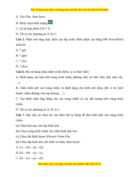 Câu 5. Phần mở rộng mặc định của tệp trình chiếu được tạo bằng MS PowerPoint 2016 là: A. *.ppt B. *.pptx C. *.xlsx D. *.docx
