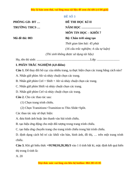 MÔN TIN HỌC – KHỐI 7 Mã đề thi: 003
