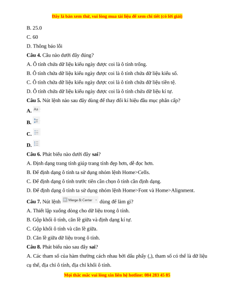 Câu 3. Khi gõ biểu thức =SUM(10,20,30)/3 vào 1 ô tính bất kì, mặc định kết quả hiển thị trong ô tính là: A. 20