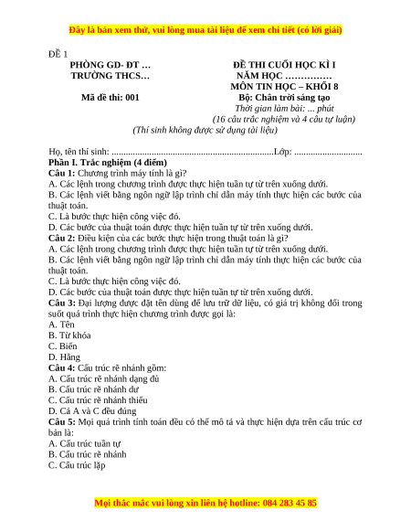 Đề thi cuối kì 2 Tin học 8 Chân trời sáng tạo (Đề 1)