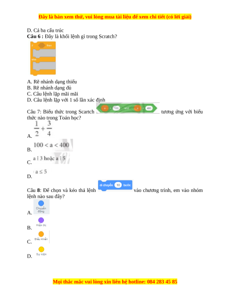 Câu 6 : Đây là khối lệnh gì trong Scratch? A. Rẽ nhánh dạng thiếu B. Rẽ nhánh dạng đủ C. Câu lệnh lặp mãi mãi