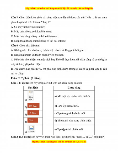 Câu 1. (3 điểm) Em hãy ghép các nút lệnh với chức năng của nó: Nút lệnh Chức năng