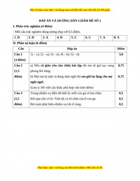 ĐÁP ÁN VÀ HƯỚNG DẪN CHẤM ĐỀ SỐ 1