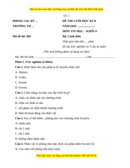 MÔN TIN HỌC – KHỐI 4 Mã đề thi: 002 Bộ: Cánh diều