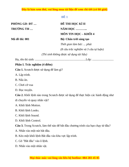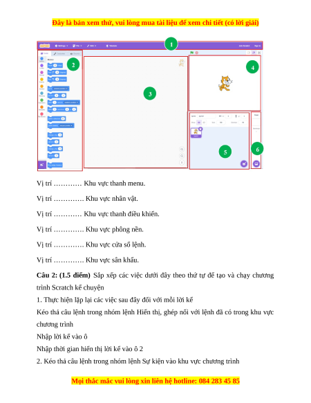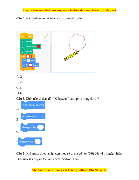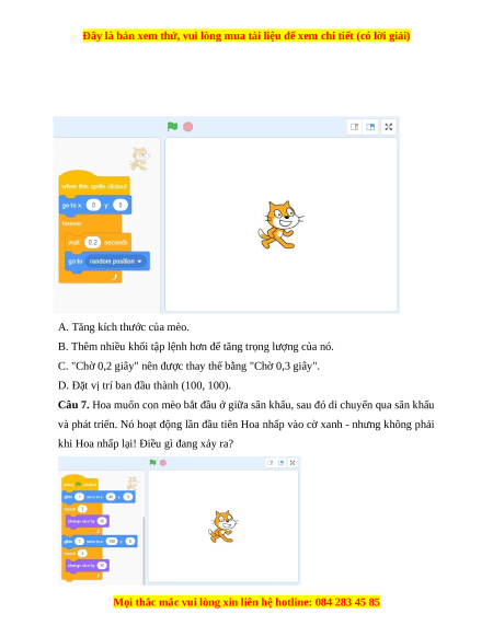 Câu 1. Scratch được sử dụng để làm gì? A. Lập trình. B. Nấu ăn. C. Chơi cờ vua D. Đọc truyện.