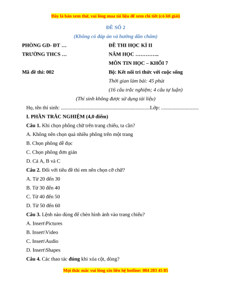MÔN TIN HỌC – KHỐI 7 Mã đề thi: 002