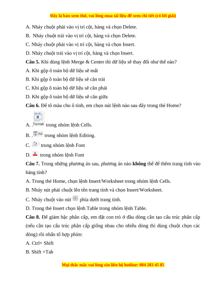 Câu 4. Các thao tác đúng khi xóa cột, dòng?