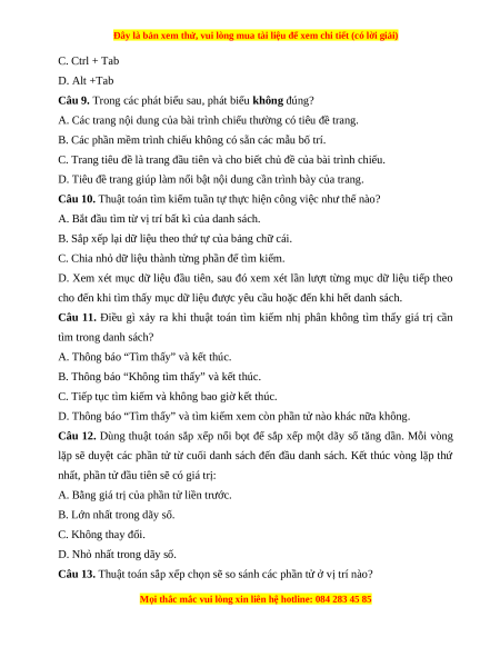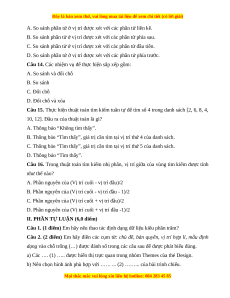 Câu 14. Các nhiệm vụ để thực hiện sắp xếp gồm: A. So sánh và đổi chỗ B. So sánh C. Đổi chỗ D. Đổi chỗ và xóa